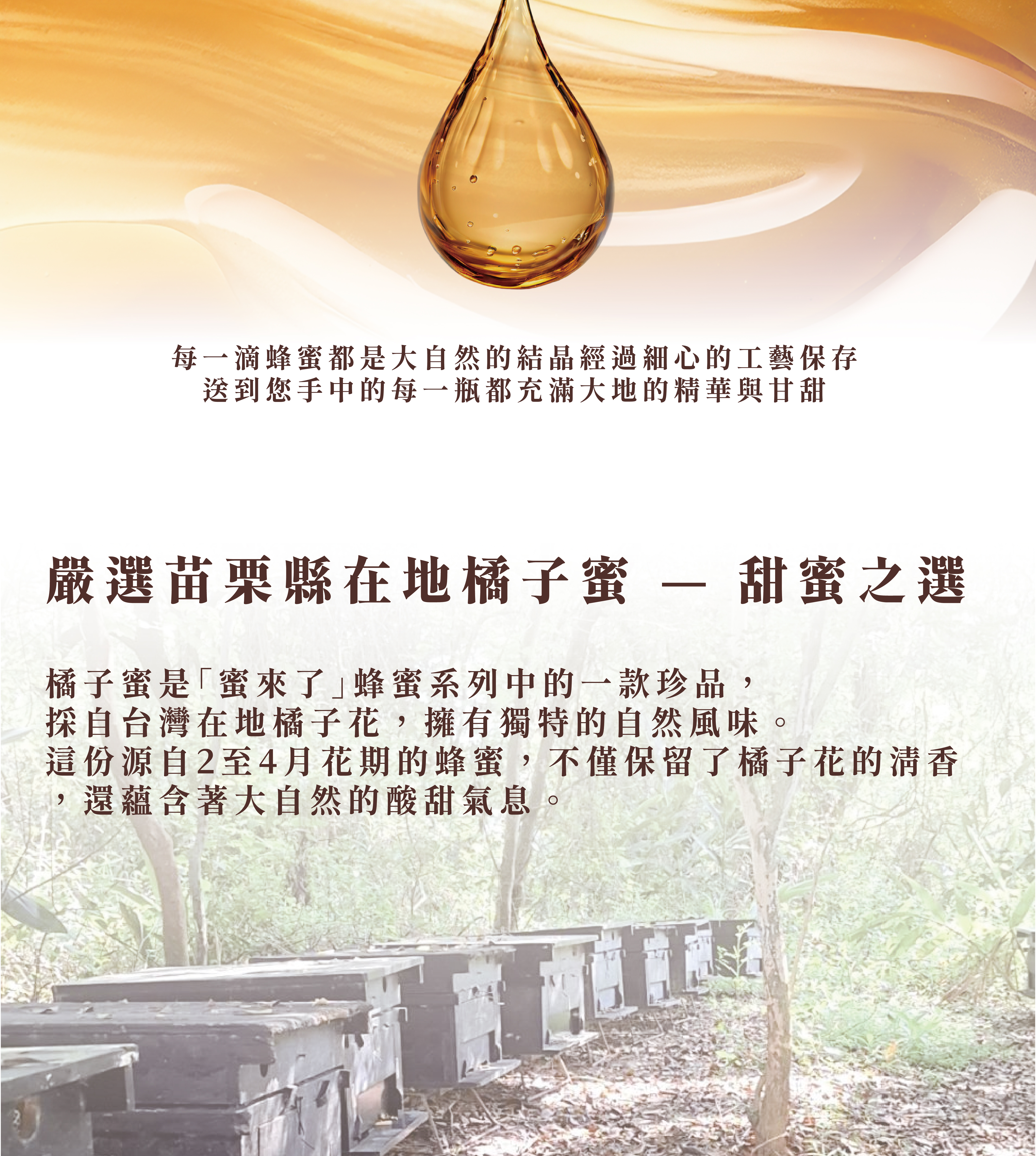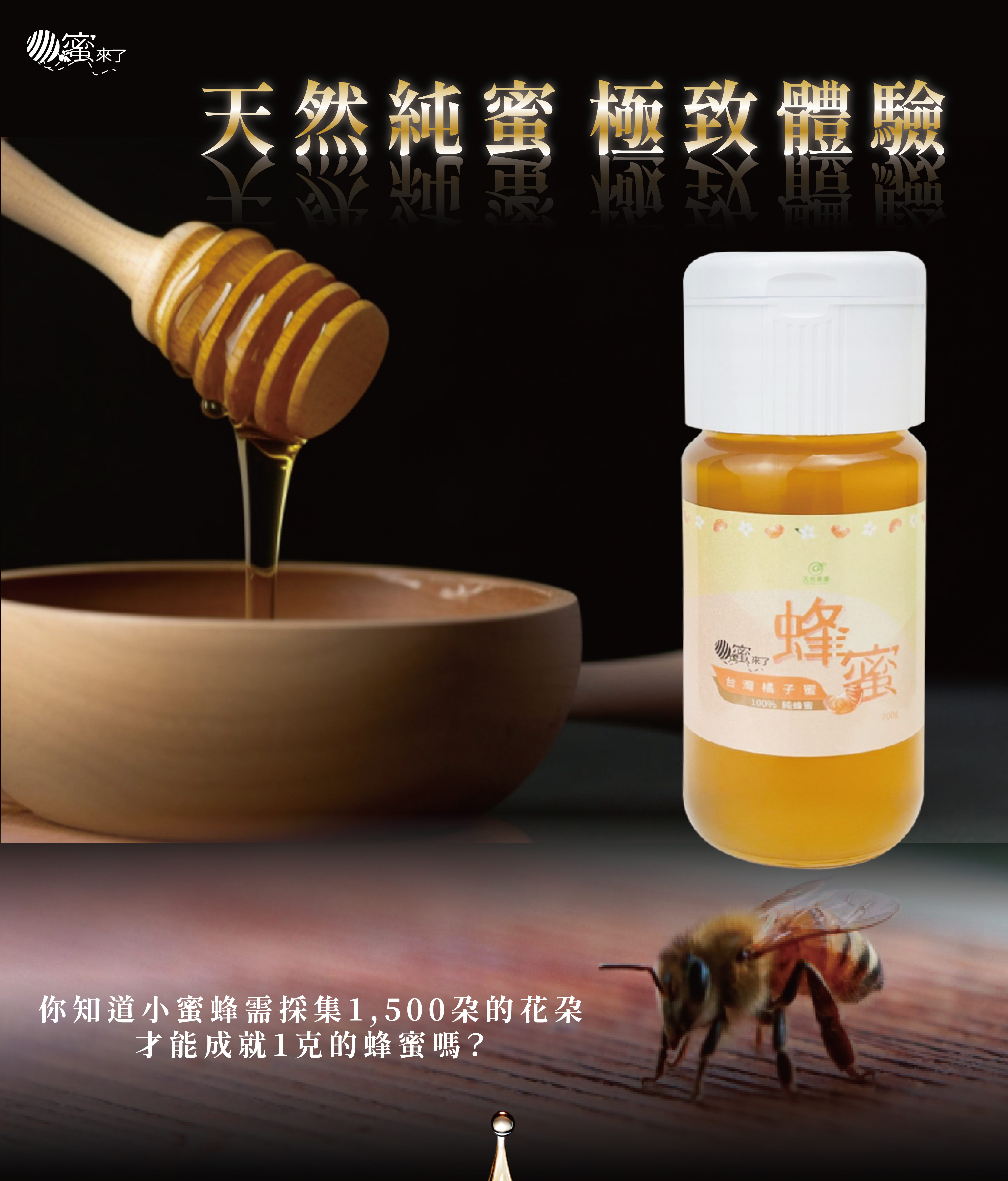 100%天然純蜜,無添加任何人工物質,無稀釋、無添加糖。每一瓶蜂蜜都是從田野間採集的新鮮蜂蜜,保持其天然風味與營養。