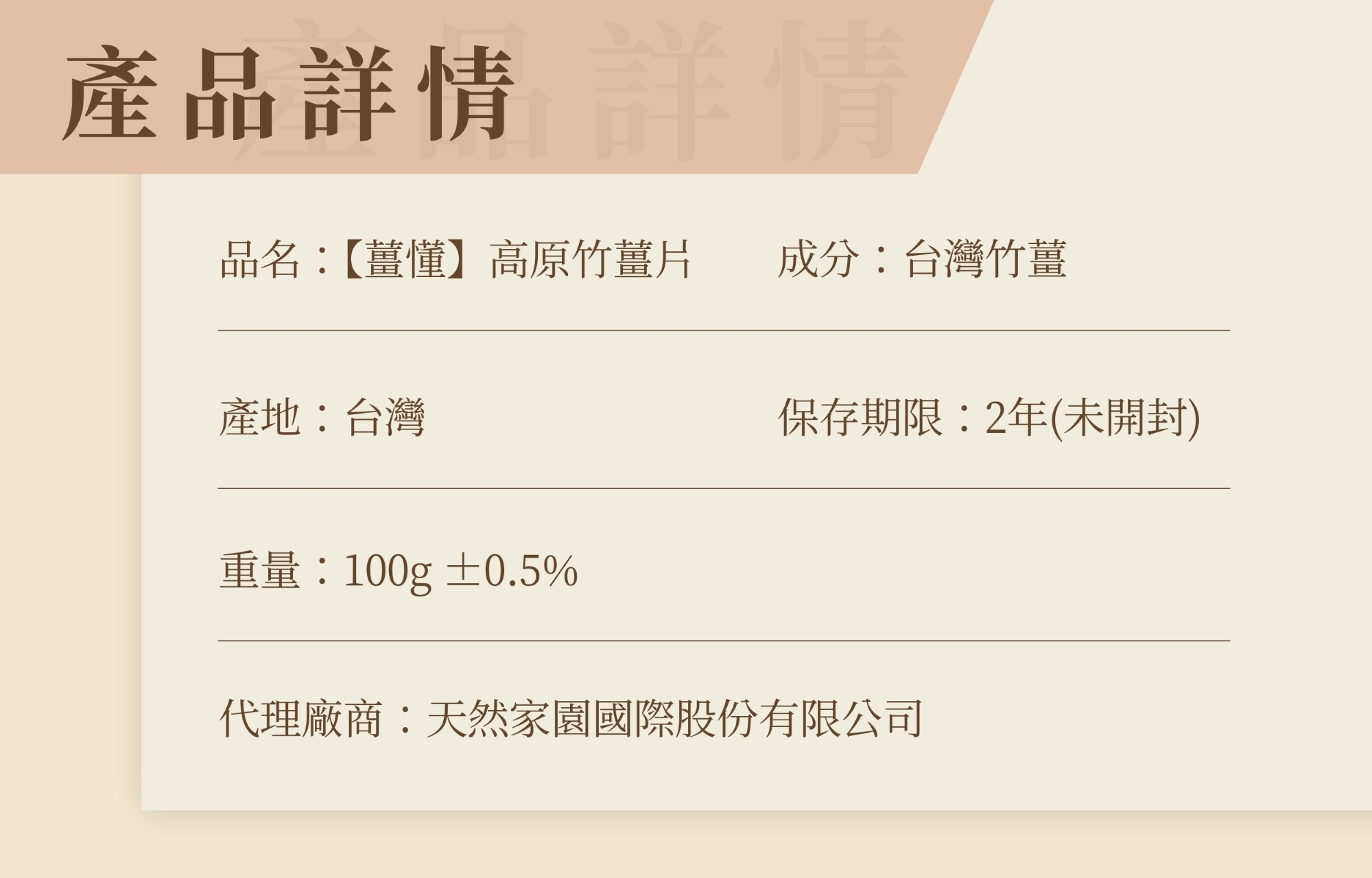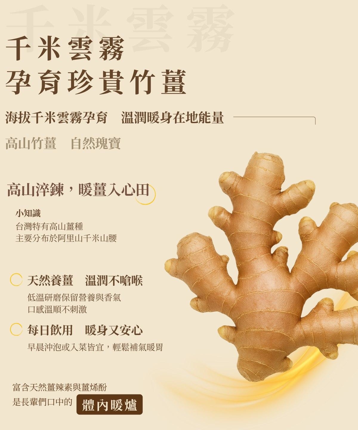 取自台灣阿里山高山竹薑,由當地小農以天然方式栽種,以手工日曬保留最原始的香氣與活力。