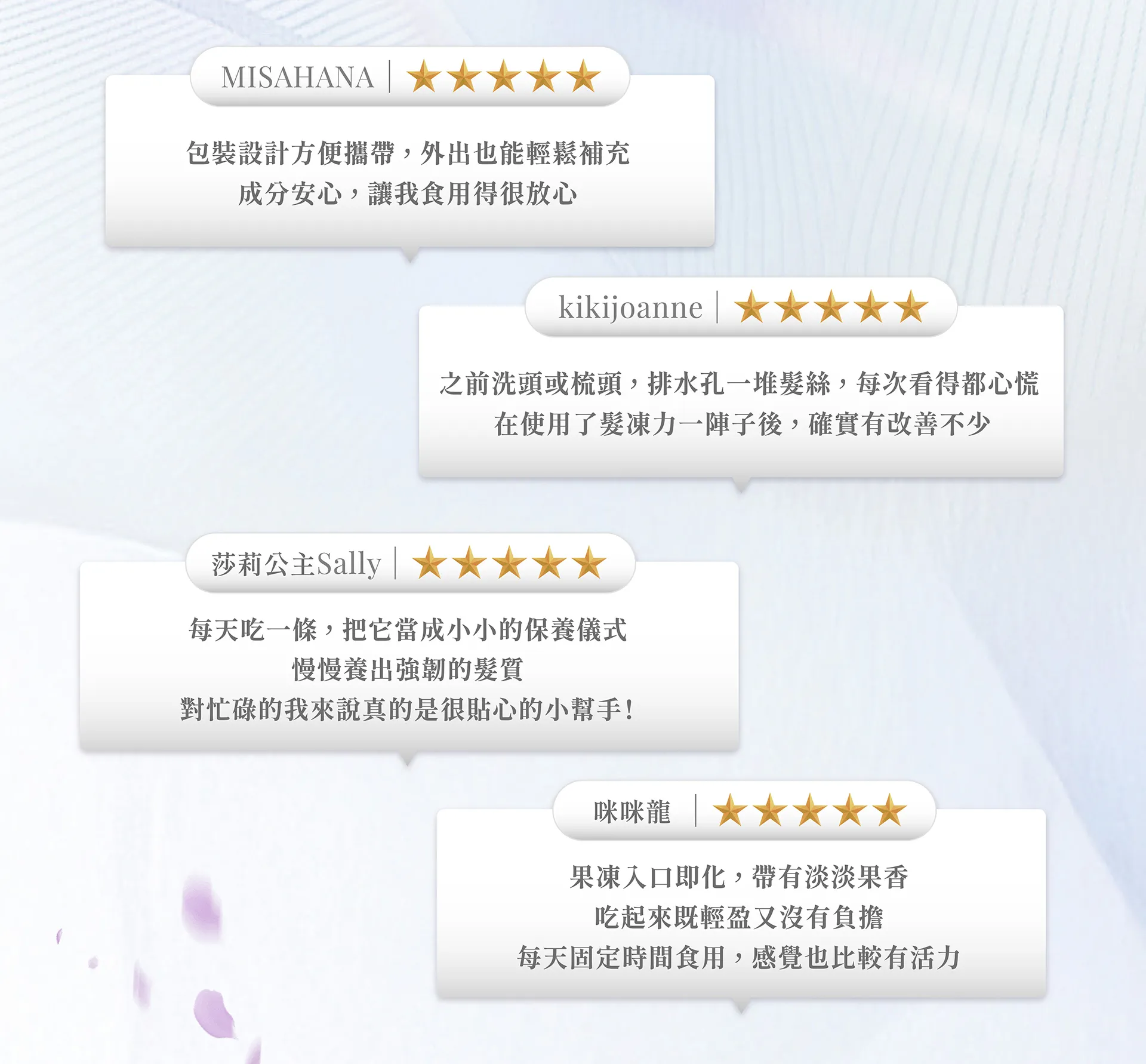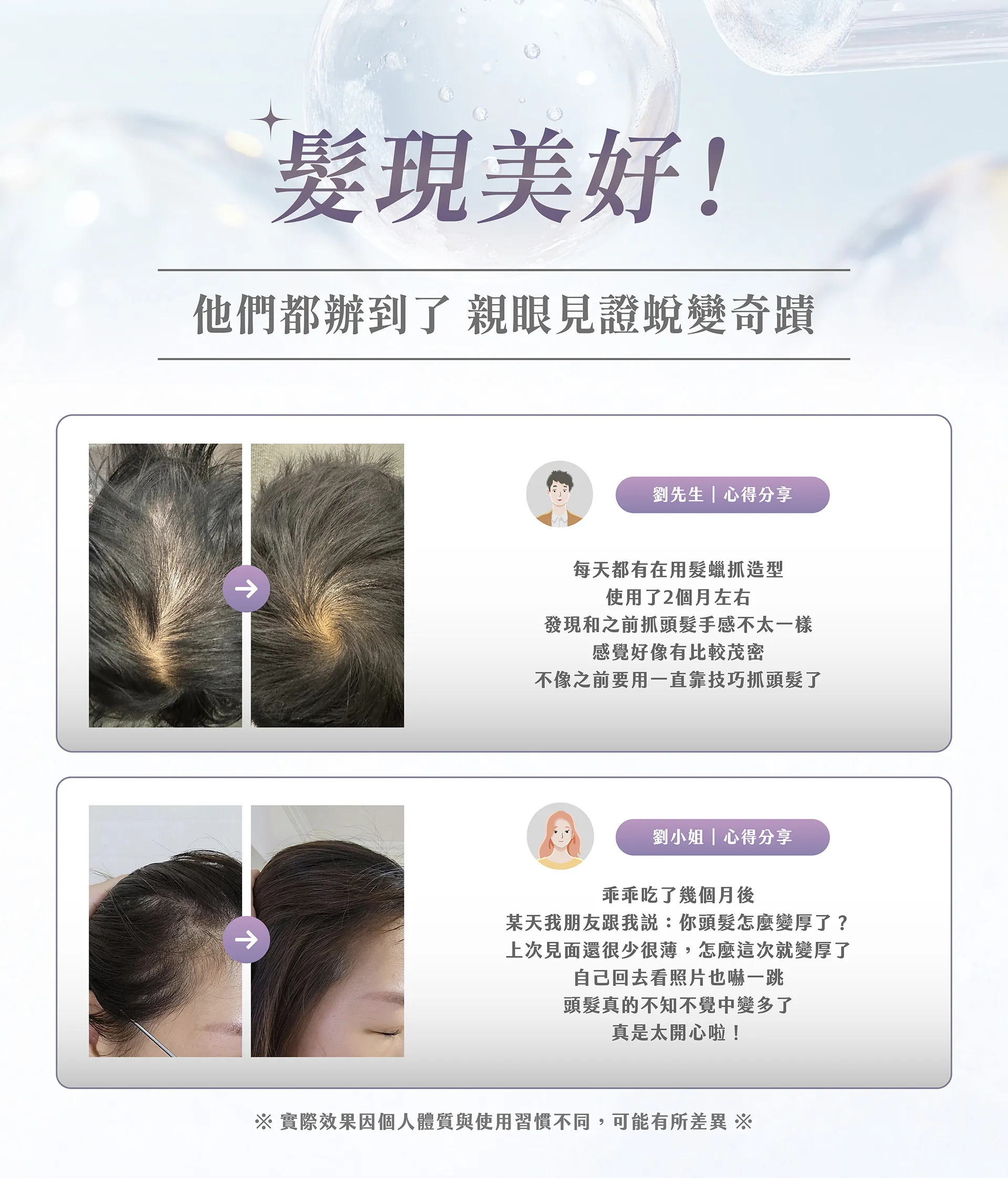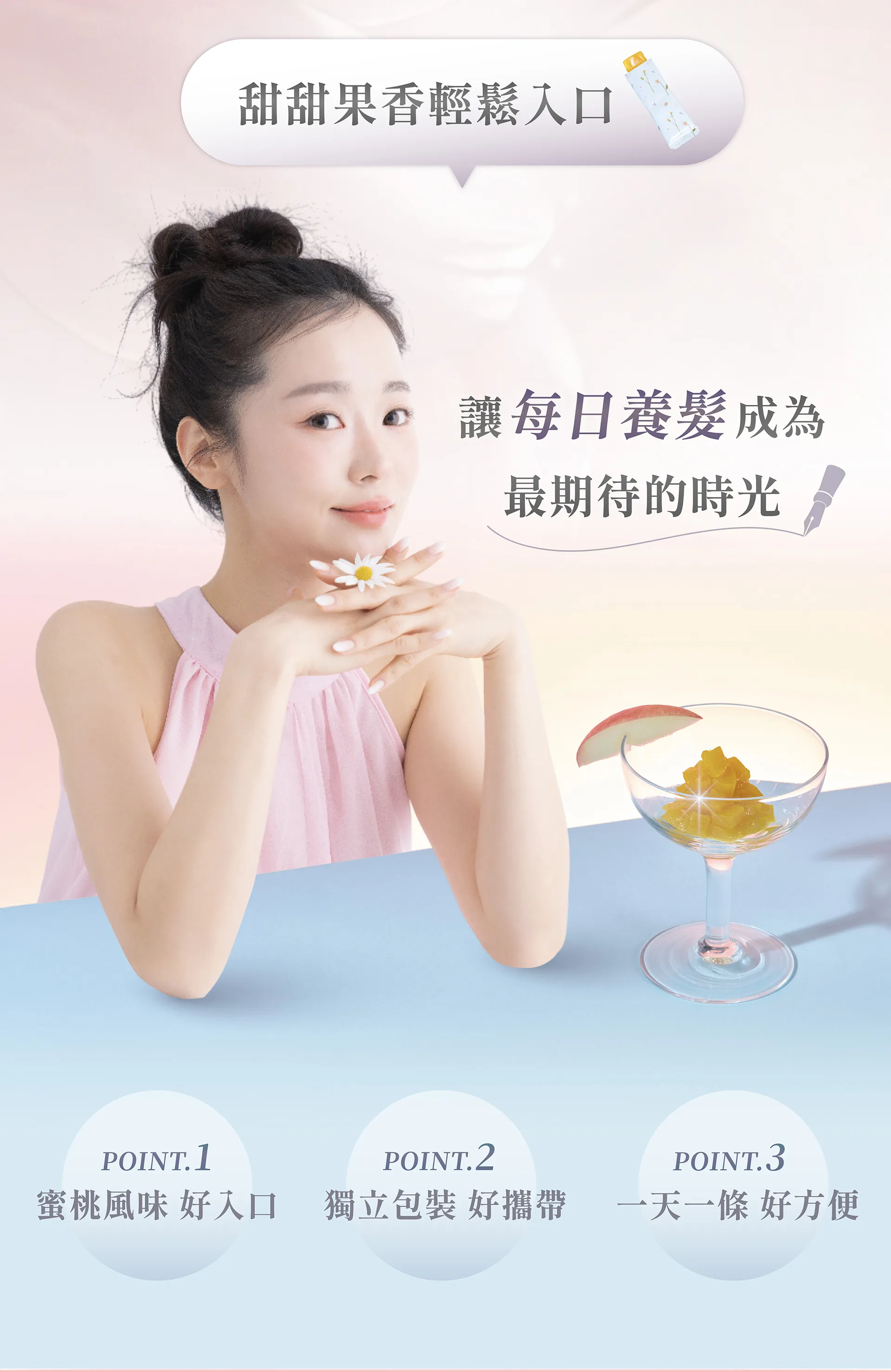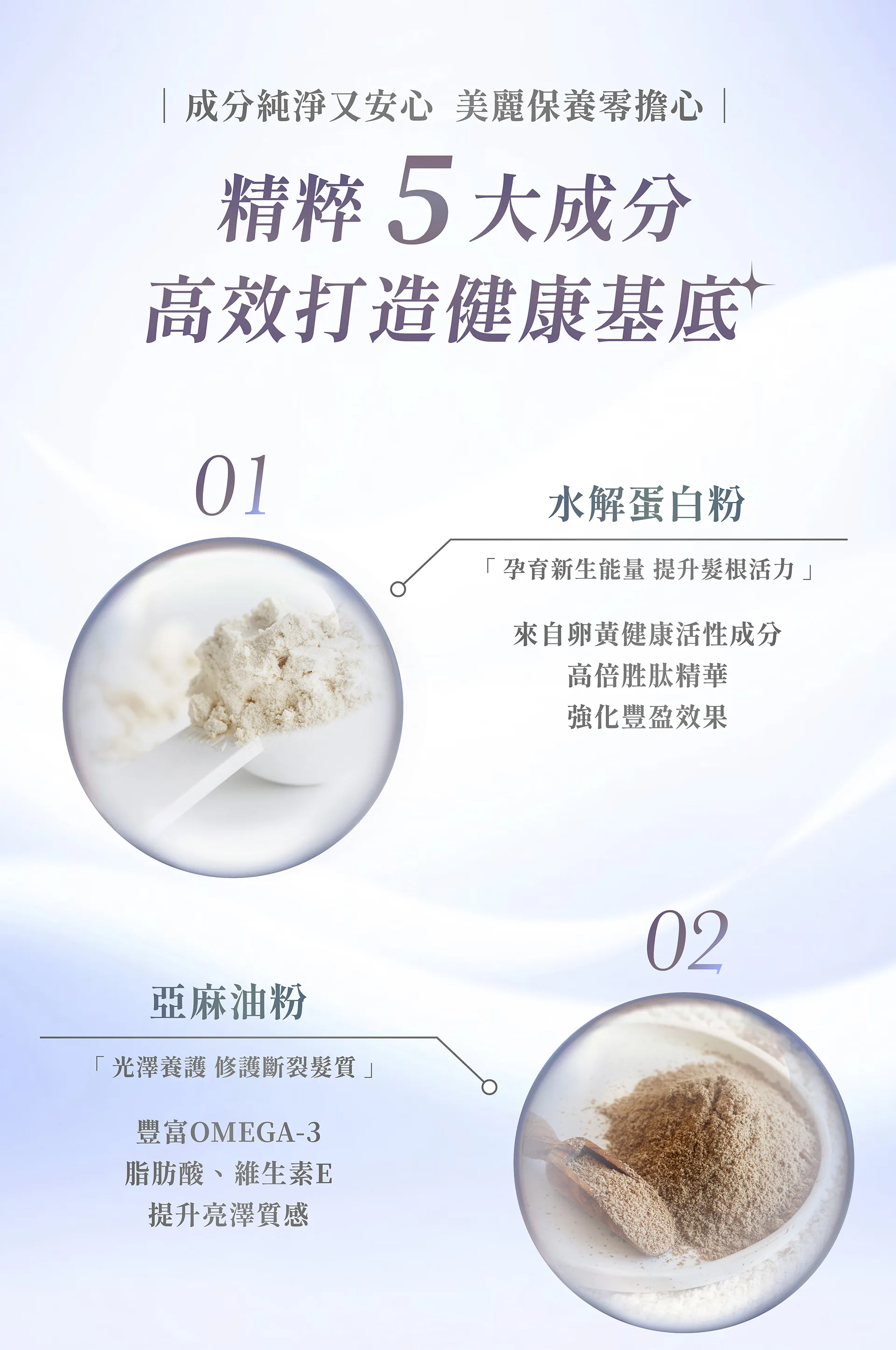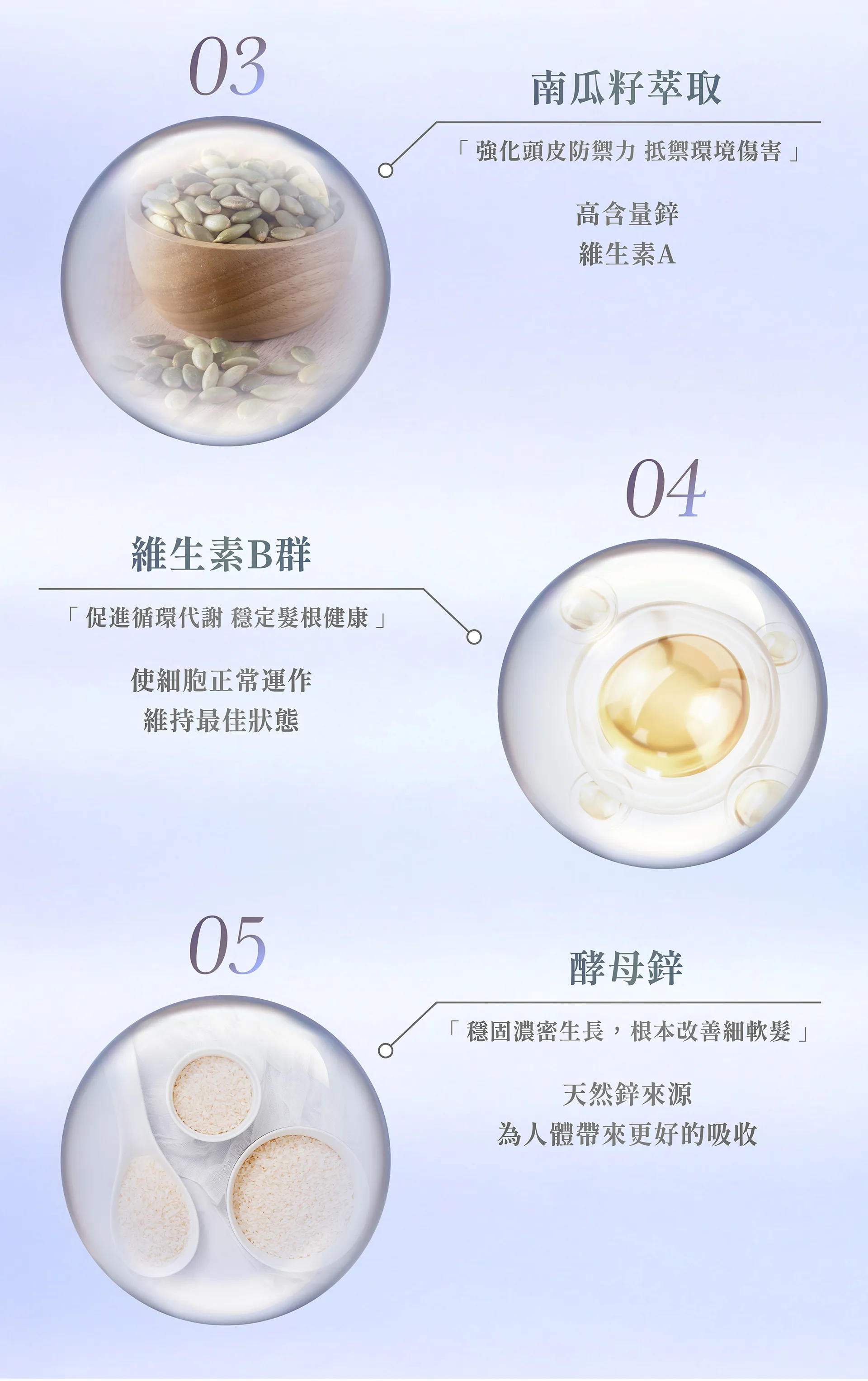 🔸每日輕鬆補給,髮絲從根打底富含B群、鋅、蛋黃勝肽,補充毛囊所需營養。